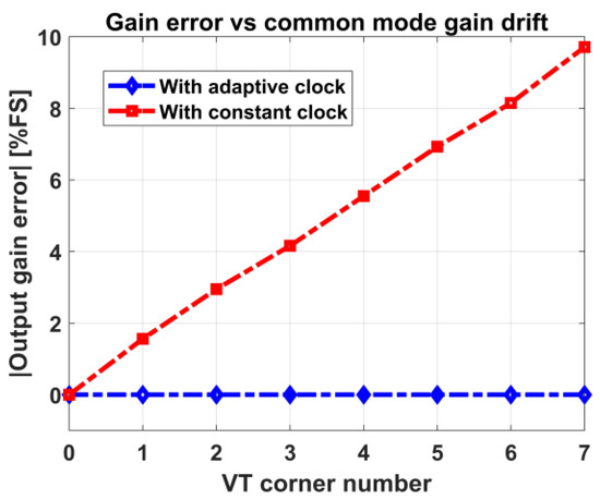 Figure 7 shows the measured gain errors of Architecture-1 with an adaptive clock frequency and an equivalent structure with a constant frequency clock, in the occurrence of only a common mode gain drift of both VFCs which is emulated by varying the VT corner numbers in Table 1. To make the quantization error not mix with the gain error computation, the averages of 32,768 successive digital output values were used. As a result, the structure with a constant clock frequency shows up to a 10% change in the output gain error for the specified range of VT corner numbers, whereas the use of an adaptive clock frequency effectively cancels these errors due to the purely ratiometric effect it brings to the output expression.