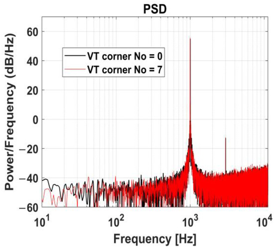 PSD plot of the output of Architecture-1 for two extreme VT corner numbers with an adaptive clock and parameters listed in Table 2.