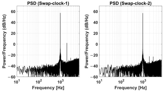 PSD for two cases of swapping clock sources under a 6.25% mismatch between the two VFCs.