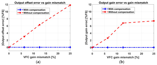 Figure 11 shows the measured gain and offset errors for the four gain mismatch values. It can be observed that both the offset and gain errors grow with increasing mismatch for the uncompensated structure. For a 25% mismatch, the offset error was reduced from around 11.8% (without compensation) to 0.01% (with compensation) whereas the gain error was reduced from around 7.4% (without compensation) to 0.79% (with compensation).