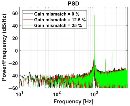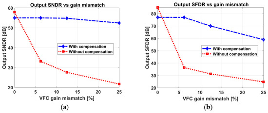 The dynamic performance of Architecture-1 for three mismatch values can be observed from the corresponding PSD plots in Figure 12. It is shown that there is a slight increment in the distortion levels as the magnitude of the mismatch is increased. This impact is better observed in the output SNDR and SFDR, as displayed in Figure 13. For the architecture without compensation, a mismatch greatly deteriorates the output SNDR and SFDR. For the architecture with compensation, the output SNDR is relatively maintained at close to 53 dB for a 25% mismatch. The output SFDR shows some degradation after a 6.25% mismatch. This is related to the remaining swapping period errors that grow slightly with increasing mismatch levels. It is to be noted that 25% is a huge mismatch value and this architecture is expected to show high robustness when operated in real harsh surroundings.