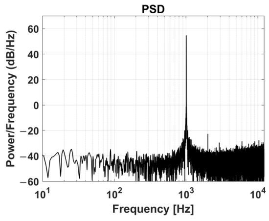 The second proposed architecture, as in Figure 5, was implemented on a ZYBO where one of the on-chip ADCs was used as the analog front end. The parameters used in the implementation are listed in Table 3. The ADC has a specified resolution of 12 bits and a sampling rate of 962 kS/s [24], which will be half in our case since it is sequentially sampling the two voltages of the differential input. The ADC is configured to work as an independent mode to avoid sequencing through other channels to preserve the maximum sampling rate. The differential inputs are supplied from an external source with a common mode voltage, Vc = 500 mV, an amplitude, Apk = 250 mV, and a frequency of 1 kHz. The clock frequency of the ADC, , and the NCO, , are both 200 MHz. The size of the phase accumulator register, , is chosen to be 14 bits, which makes the NCO center frequency, fc, equal to 25 MHz.
