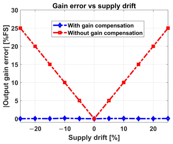 The block which is sensitive to external factors is the ADC. One of the common issues, when operating in harsh environments, is the drift of the supply voltage (the bridge excitation voltage or the ADC reference voltage), which causes a gain error on the digital output. Such supply variations are emulated by supplying scaled inputs to the ADC. The scaling factor was varied from −25% to 25% in steps of 5%. The output of the ADC is used as an output of uncompensated structure to compare it with the finally compensated system level output. The measured variation of the output gain error with the emulated supply drift is plotted in Figure 15 for both the ADC output and the output of the whole system. The magnitude of the gain error at the output of the ADC varies almost proportionally with the level of the supply drift up to a maximum of 25%, whereas only a maximum of 0.1% gain error is recorded for the whole system. As a consequence, external impacts such as temperature variations or ADC gain shifts are also expected to be canceled out due to the ratiometric nature of the digital output. The maximum recorded offset error for the whole range of supply drift is 0.1%.