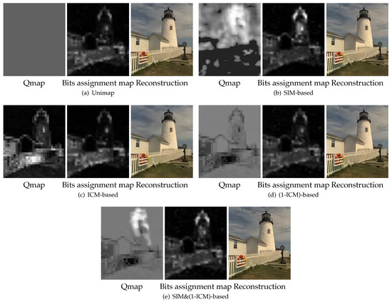 In a communications scenario, hybrid-context DIC should be able to perform fast rate and context adaptation to accommodate variations in channel capacity and changes in user application. A common way to do this is to train different DIC models for different bitrates and contexts [10]. However, this method can only achieve discrete adaptation, and it needs significant storage and computation resources to cover different combinations of contexts and rates. The conditional encoder-based, rate-adaptive DIC uses a single deep model and implements variable-rate image coding by generating different latent vectors according to the input conditions [11,12]. However, these encoding mechanisms are mainly optimized for image reconstruction, and they can degrade the image quality at low bitrates, leading to negative performance impacts on downstream machine tasks. To solve this problem, researchers have proposed an algorithm in [13], that uses a quality map (Qmap) to control the coding quality of each pixel at different bitrates and provide context-adaptive coding. This approach prioritizes the high-quality reconstruction of semantic salient regions at low bitrates to preserve the computer vision task’s performance, while also ensuring the high-quality reconstruction of the whole image at high bitrates. This adaptive DIC mainly relies on a variable-rate regions of interest (ROI)-based coding scheme, which balances the classification and reconstruction contexts in the allocation of bits.