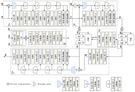Figure 3 illustrates the network structure of this implementation, which consists of an encoder , a decoder , an entropy model side information encoder , an entropy model parameter generator g, and a discriminator D. The variable rate codec backbone network is similar to [13], except that we use conditional GAN to train the decoder. During training, the coding quality vector and the quantized latent vector serve as the conditional input for the conditional GAN. The codec process of the proposed algorithm can be written as follows: