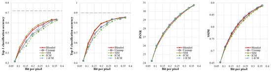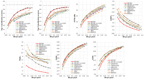 As shown in Figure 7, and QMAP2021 have similar PSNR, but outperforms QMAP2021 for other metrics. The most significant improvement is in classification accuracy, with average increases of and in the Top-1 and Top-5 classification accuracy, respectively, within the rate range. For NIQE, LPIPS, FSIM, and SSIM, the relative performance average improvements are about , , , and , respectively. These results demonstrate that appropriate weighting of can simultaneously improve classification and perception performance. HEVRC has a comparable performance in classification accuracy to , but the superiority of HEVRC is mainly in the perception performance, with relative performance improvement values of and for NIQE and LPIPS, respectively. In terms of PSNR and SSIM performance, HEVRC has a 0.95 dB lower PSNR and a relative decrease of in SSIM metrics compared to . The comparison between HEVRC and further confirms the trade-off between perception and distortion.
