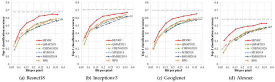 Adaptation analysis of different classification models. In the experiments above, the same feature extractor network is used for both semantic analysis and SFM loss calculation in HEVRC. To validate the adaptability of our proposed method to different downstream classifiers, we further evaluated the classification performance of HEVRC using four other pre-trained classification models. Figure 9 shows the results of classifying the reconstructed images using Resnet18 [66], Inceptionv3 [67], Googlenet [68], and Alexnet [69] on the ImageNet dataset. The results show that HEVRC achieves the best classification performance in different classification models, and the classification accuracy is close to the original image’s accuracy at higher bitrates. These results demonstrate that the proposed SFM loss-based method for improving the classification accuracy of reconstructed images has a certain generality and can adapt to multiple different classification models. In addition, the Qmap generation mechanism based on the fusion of SIM and ICM also shows generality in protecting semantic information at different bitrates across different classification models.