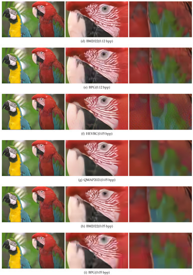 Figure 10 shows the reconstructed images produced by four different algorithms at various bitrates. The following observations can be made: First, at lower bitrates, BPG’s reconstructed images show block artifacts, while QMAP2021, BM2022, and HEVRC do not. This is because BPG uses block coding, such that differences between blocks at low bitrates can cause block artifacts. In contrast, DIC algorithms encode the whole image. Second, the reconstructed images produced by BPG, BM2022, and QMAP2021 look blurry, especially at low bitrates, while those produced by HEVRC look sharper and more realistic. This is because BPG, BM2022, and QMAP2021 are optimized with MSE loss, while HEVRC adds the GAN loss, which is known to yield perceptually sharper and more realistic images. Third, in HEVRC and QMAP2021, the pixels in the regions most relevant to the classification category have better reconstruction quality (e.g., the parrot’s head and lighthouse top), even at lower bit rates. Moreover, when comparing the non-salient regions of the reconstructed images generated by HEVRC, BM2022, and QMAP2021, HEVRC has better visual quality for objects such as clouds, grass, and road signs in the background. This is mainly due to the GAN loss and SFM loss, which can better preserve the contour information in the entire image. Furthermore, during the Qmap generation process, HEVRC improves the overall coding quality by suppressing the coding quality of complex regions, providing higher reconstruction quality for a larger range of pixels at the same bitrate.