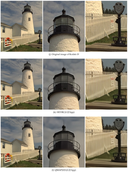 Visual effects. The proposed DIC framework uses SFM and GAN loss terms to optimize the similarity of high-level semantic features and the distribution similarity between the reconstructed image and the original image, respectively. The high-level semantic similarity makes the reconstructed image easier to recognize, while the distribution similarity makes the reconstructed image look more realistic and perceptually better. In Qmap-based rate-adaptive coding, a Qmap generation mechanism combines SIM and ICM to ensure priority reconstruction of semantic salient regions while also considering the reconstruction of semantic non-salient regions. In the previous sections, we showed that the HEVRC algorithm achieved the best performance in both classification accuracy and perceptual quality in the quantitative performance comparison analysis. In this section, we select two typical images from the Kodak dataset and compare the visual effects of HEVRC with QMAP2021, BM2022 and BPG to demonstrate the superior visual performance of HEVRC.
