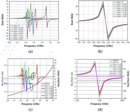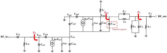 As shown in Figure 2, the output network is composed of the harmonic network and the output matching circuit. The harmonic network, which is mainly formed by combining the proposed output capacitance with the harmonic circuit (, ) and the fundamental frequency resonator (, ), is responsible for keeping the harmonic components at the drain level, as shown in Figure 2. This structure is expected to guard the voltage third harmonic and current second harmonic components to shape the drain’s voltage and current components, respectively, as well as possible. Analytically, the input impedance of the harmonic network can be expressed as a function of the capacitance = f(), as illustrated in Expression (7).
