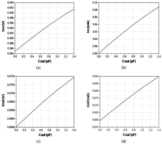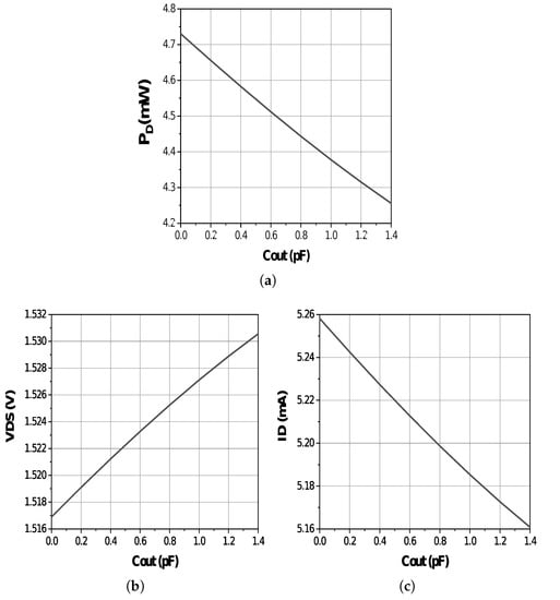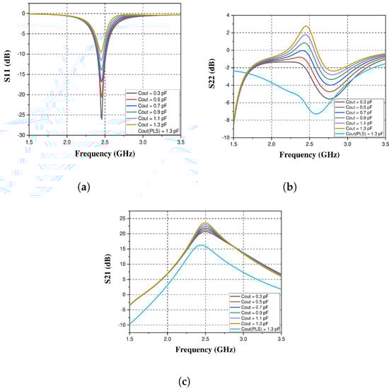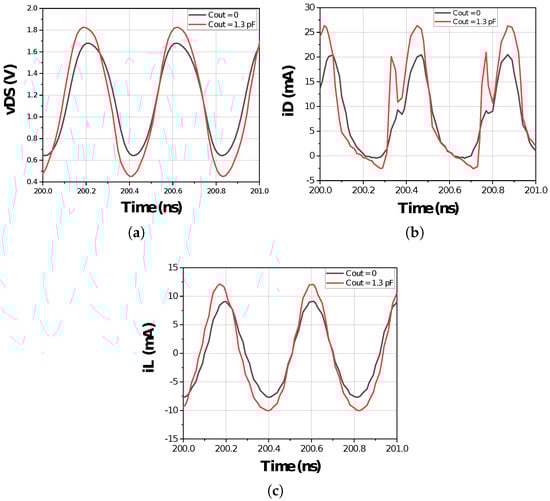 Before tackling the effect of lossy components in this section, it is necessary to point out that optimizations to the layout have led to the suppression of the inductance of the PA because the output matching can only be ensured by the output network effect associated with capacitance . In addition, post-layout simulations were performed with an extreme capacitance value ( = 1.3 pF). As shown in Figure 8a, the added output capacitance increased the insertion loss in the PA’s input and output by 16 dB and 5 dB, respectively, even when considering an impedance transformation between an optimal resistance and an of 50 ohm. This would be essentially due to the mismatches in the input–output impedances while varying . Such an effect could be overcome using variable capacitances as varactors in the input–output matching networks. In contrast to real component simulations, where is superior to 0, as seen in Figure 8b, PLSs reveal 6 dB ( = 1.3 pF) without . Moreover, an advantage of this work is the improvement in by 4 dB, as shown in Figure 8c, while tuning the added capacitor. A maximal value of = 1.3 pF should decrease in hand the harmonic network impedance and therefore decrease the total output impedance to reduce the dissipate power in the other hand. However, causes mismatches in the output matching network as a drawback of the added capacitor. The effect of is also significant for the drain waveforms, as shown in Figure 9a,b. In fact, during the positive half-cycle, the drain voltage attains a maximal value of 1.8 V whereas the minimal value of the drain current is 0 mA. In the second half-period, the maximal value of the drain current is 26 mA while the minimal value of the drain voltage is V. As a result, the dissipate power will decrease, allowing for the efficiency to increase. Furthermore, the load current is large with the added capacitor , as illustrated in Figure 9c, leading to a higher output power and power gain. However, the only observed drawback in Figure 9 is a fast shift in the operating frequency between the waveforms extracted by null and , equal to 1.3 pF. Such a shift is the effect of in the output matching network.