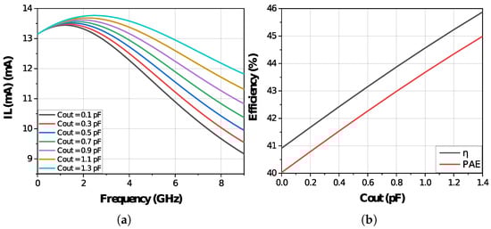 Analytically, two important parameters are sufficiently demonstrated to illustrate the effect of on the PA’s performance improvement. In fact, Figure 7a illustrates the output current experienced to the load with frequency evolution for different values of , following the expression (28). This figure demonstrates a substantial consequent increase in the load current and output power. Furthermore, serves to broaden the PAs bandwidth, as this capacitance permits an overall quality factor degradation. Similarly, the drain efficiency and the added power efficiency PAE as functions of capacitance (Expressions (26) and (27)), are shown in Figure 7b. These two performances are clearly improved by 5%, from 40% to 45% for the first one, and from 41% to 46% for the second.