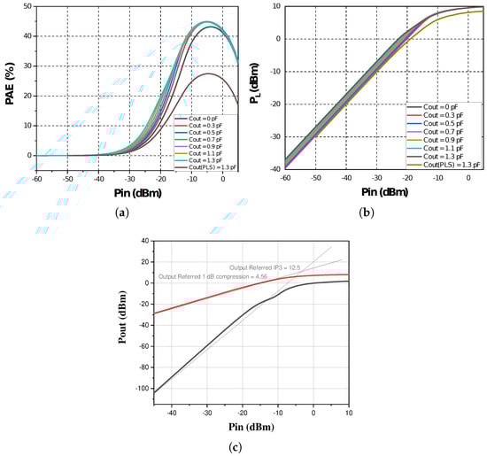 The most important results of this work are demonstrated in this section, where the key output parameters of the designed class-F power amplifier are presented. In Figure 10a, we can observe that, in the back-off region between −30 dBm and −10 dBm, the maximum PAE increased by 10% for Pin = −20 dBm. This can be observed while taking the input–output impedance mismatches due to into consideration. Moreover, the saturated efficiency PAE also increased from 43% () to 45% (= 1.3 pF). In Figure 10b, the power gain is shown to be quite flat. Second, the added output capacitor did not have any effect on the compressed output power (−1 dB), which remains practically constant. Furthermore, it increases for = −40 dBm, from −21 dBm () to −16 dBm ( = 1.3 pF) and for = −20 dBm from −1 dBm ( = 0) to 3 dBm ( = 1.3 pF). Similarly, for = −20 dBm, the power gain increased from 18 dB ( = 0) to 23.7 dB ( = 1.3 pF). In other words, the output power is enhanced in the power back-off region.
