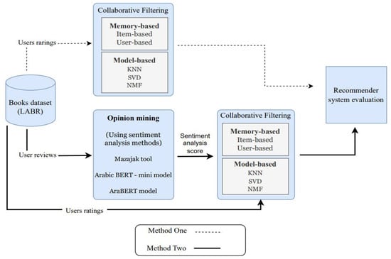 We proposed a collaborative filtering recommender system for Arabic content. We used two different methods to build the model and then compared the results of the two methods, as shown in Figure 1. In the first method, we used users’ ratings from the LABR dataset as input to collaborative filtering (memory- and model-based) algorithms that produce recommendations. In the second method, we used users’ reviews from the LABR dataset as input to opinion mining (sentiment analysis) models and we integrated the results of opinion mining with users’ ratings from the LABR dataset as input to (memory- and model-based) collaborative filtering algorithms to produce recommendations. We then evaluated and compared the performance of the two methods.