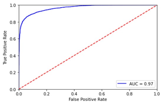 We also conducted a sentiment analysis using the Arabic BERT–mini model. The Arabic BERT–mini model [7,34], was trained on 8.2 billion words extracted from the Arabic version of the Open Super-Large Crawled ALMAnaCH Corpus (OSCAR) [35], a recent dump of Arabic Wikipedia [36], and other Arabic resources, for a total of 95 GB of text. We trained the model on four datasets: SS2030 [37], 100 k reviews [38], ArSAS [39], and the Arabic Sentiment Twitter Corpus. The fourth dataset led to the best performance. Thus, we used this public dataset to tune the model [40]. This dataset contains 58,000 Arabic tweets (47 k training, 11 k test) categorized as positive or negative. After this training, the model was ready to classify the LABR dataset. Figure 2 shows the receiver operating characteristic (ROC) curve for the Arabic BERT–mini sentiment analysis model. We used the Python programming language for implementing our models and Google Colaboratory (also known as Colab) platform.