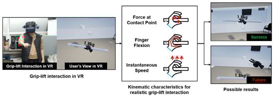 Although sophisticated and delicate interactions are possible in VR via three-dimensional movements of human hands, the diversity in hand gestures and motions also requires users to memorize and learn the interaction mechanisms in advance [11,12]. In addition, most bare-hand interactions do not consider the kinematic characteristics of hands in VR, e.g., how the user grabs and holds the object, or how much hand force is involved when they perform grip-lift actions. There was some research that tried to effectively mimic the hand interactions in the real world considering kinematic characteristics [2,13], but the studies mostly focused on (or were limited to) the consideration of touch points between the hand and the target objects, which could still cause a lack of realism.