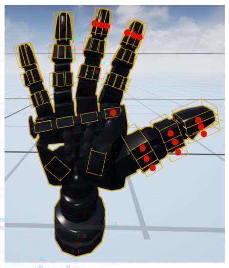 A virtual hand model that shows the finger parts (possible contact points) and the force weights. The yellow boxes are the offset areas including contact points. The boxes with the red circle are assigned with double weight—twice stronger force than the box without the red circle. The hand model was from Epic Games’ Unreal Engine.