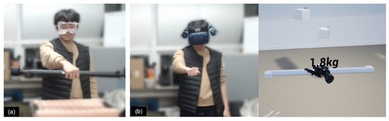 HTC Vive Pro was used to render the virtual environment and the grip-lift simulation with virtual objects to lift. We used a virtual hand model provided in Epic Games’ Unreal Engine 4.25 (Epic Games’ Unreal Engine: https://www.unrealengine.com/ (accessed on 6 April 2022)) and developed an interface for the user to move their virtual hands in the VR environment while they were moving their own hands in the real world. HTC Vive Hand Tracking SDK (HTC Vive Hand Tracking SDK: https://developer.vive.com/resources/vive-sense/hand-tracking-sdk/ (accessed on 6 April 2022).