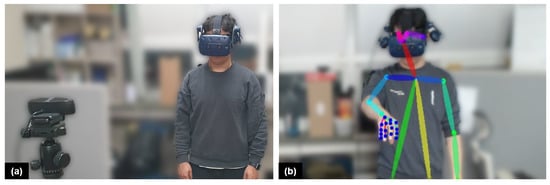 Setting for quantitative hand pose similarity evaluation: (a) view in third person perspective with RGB camera, and (b) estimated pose with OpenPose [43].