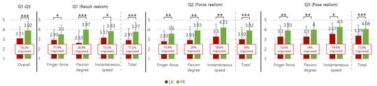 Again, for the average of all three interaction scenarios, the score in the FK condition () was higher than the score in the LK condition () with statistical significance; , p < 0.001, (effect size: large) (see Figure 6—Q3). This means that participants felt their hand poses in the FK condition were more similar to the poses in the real grip-lift interaction with the real object compared to the LK condition.