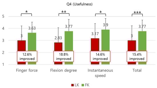 The results of Q4 (Usefulness) showed that the score in FK (), which considered three kinematic characteristics of hand, was higher than the score in LK (); , p < 0.001, (effect size: large) (see Figure 7). For the details in different interaction scenarios, we found statistically significant differences in all three scenarios.