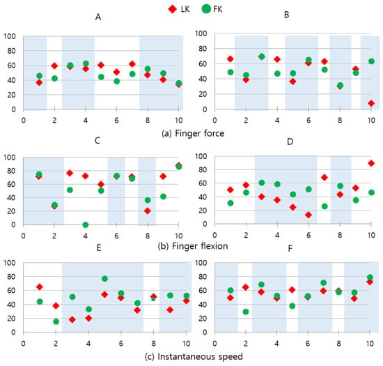 We compared each participant’s hand pose similarities to the baseline real setting between the FK condition and the LK condition. Figure 8 shows the details of the similarity scores in all three interaction scenarios, which were described in Table 1. In the interaction scenarios related to finger force, more participants showed hand poses similar to the real grip-lift situation in the FK condition (A: 11 participants, B: 10 participants) compared to the LK condition (A: 4, B: 5) (see Figure 8a). However, the number of participants who showed hand poses similar to the real situation was almost the same between the FK condition (C: 7, D: 7) and the LK condition (C: 8, D: 8) in the scenarios related to finger flexion (see Figure 8b). In the scenarios related to instantaneous speed, more participants in the FK condition (E: 12, F: 10) appeared again, showing similar hand poses to the real situation compared to the LK condition (E: 3, F: 5) (see Figure 8c). In general, more participants made similar hand poses to the real situation in the FK condition than in the LK condition; however, the effect did not appear to be strong.