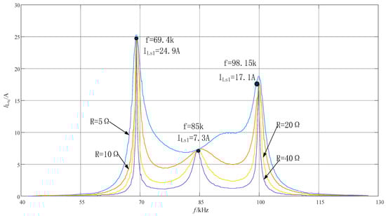 Simulation analysis of multiple resonance points of the double LCC resonant compensation system was conducted in Matlab. Figure 4 shows the relationship curve between the output current and operating frequency under different load RL. The system has multiple constant-current resonance points, with output currents of 24.9 A, 7.3 A, and 17.1 A at 69.4 kHz, 85 kHz, and 98.15 kHz, respectively. The system exhibits load-independent constant-current output characteristics. It was verified that all three resonant frequencies were in resonance and exhibited pure resistive characteristics.
