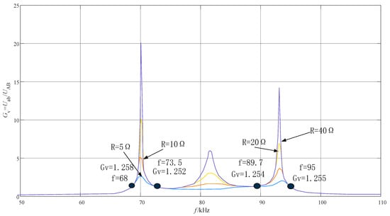 Under different load RL conditions, the system frequency was scanned from 30 kHz to 110 kHz, and multiple constant-voltage resonant points were found. Figure 5 shows the relationship between the input–output voltage gain and the operating frequency of the system under different load conditions. At 68 kHz, 73.5 kHz, 89.7 kHz, and 95 kHz, the voltage gain is independent of the load. It was verified that the system exhibits pure resistance when the resonant frequencies are 73.5 kHz and 89.7 kHz, which is consistent with the calculated results above. Therefore, the system uses 73.5 kHz and 90 kHz as the resonant frequencies for constant-voltage charging.