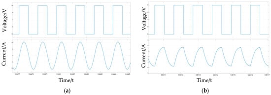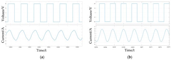 Due to the position offset of the AUV in the charging dock, the coupling coefficient decreases, and a coupling coefficient of k < 0.4 may occur. Figure 6 shows the simulation waveforms of the inverter output voltage and current when k = 0.2. Figure 6a shows the inverter output voltage and current waveforms at the resonant frequency of 73.5 kHz, and Figure 6b shows the inverter output voltage and current waveforms at the resonant frequency of 90 kHz. The current waveform in Figure 6b is non-sinusoidal, indicating that the harmonic content is high and it is easy to produce harmonic losses, especially during the device switching process, which easily leads to large switching losses. The phase difference between the inverter output voltage and current is relatively large, causing the transmission power and transmission efficiency of the system to decrease. The current waveform in Figure 6a is a sine wave, and the current amplitude is significantly increased. The phase difference between the inverter output voltage and current is almost zero, indicating that when the resonant frequency is switched to 73.5 kHz, the output power and efficiency of the underwater wireless power transfer system are significantly improved.