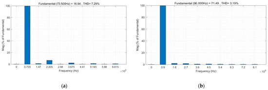 Harmonic analysis of inverter output current when the coupling coefficient is 0.2. (a) The resonant frequency is 73.5 kHz; (b) The resonant frequency is 90 kHz.