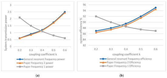 Under the identical coupling structure, the conventional double LCC resonance compensation system and the double LCC resonance compensation system with multi-resonance switching in this study are simulated and compared. The conventional double LCC resonant compensation system [29] works at a resonant frequency of 85 kHz. In this study, the double LCC resonant compensation system with multi-resonant point switching works at ω1 and ω2 resonant frequencies, respectively. Figure 10 presents the simulation comparison results of its transmission power and transmission efficiency. As depicted in Figure 10, the transmission characteristics of the conventional double LCC resonance compensation system are similar to those at the resonant frequency ω2 in this study. When k > 0.4, good transmission capability is achieved; when k < 0.4, the transmission capability turns out to be worse, whereas the coupling coefficient is low. The transmission capability of the lower system at resonance frequency ω1 is significantly enhanced, such that the transmission power and transmission efficiency of the system can be increased through multi-resonance point switching. It can be seen from Formula (22) that the higher the coupling coefficient is, the higher the output voltage is; while Formula (23) indicates that the lower the coupling coefficient is, the higher the output voltage is; Formula (24) indicates that the higher the coupling coefficient is, the higher the system transmission power; and Formula (25) indicates that the lower the coupling coefficient is, the higher the system transmission power is, which is the same as the simulation results. It can also be seen from the figure that the coupling coefficient at the lowest power point and the efficiency point is 0.4, which is the same as the calculation result of Equation (26) and is obviously the switching point of the resonant frequency. When the coupling coefficient ranges from 0.2 to 0.6, the transmission power of the conventional double LCC compensation system declines by nearly 1.9 kW, and the transmission efficiency decreases by approximately 8% to 5.5%. Accordingly, the double LCC resonance compensation system using multi-resonance point switching is capable of significantly increasing the transmission power and transmission efficiency, while the system is endowed with higher stability and anti-offset capability.
