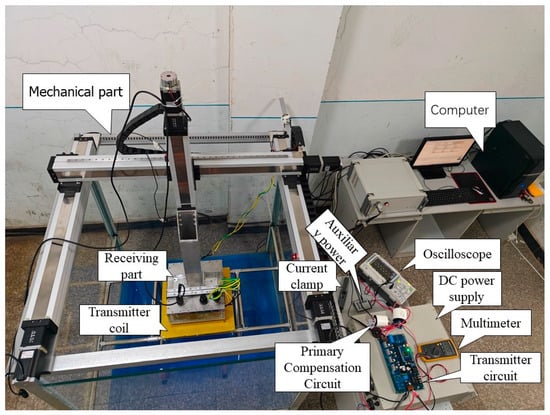 An underwater wireless power transfer system with a power of 1.3 kW is developed, and the experimental platform built is illustrated in Figure 11. The experimental platform comprises a transmitting part, a receiving part, a compensation network, a coupling mechanism, and a mechanical part. The transmitting part can be achieved by a high-frequency inverter circuit, and the receiving part refers to a high-frequency rectifying circuit. The compensation network comprises capacitors and inductors [30,31,32]. The compensation capacitors are film capacitors. Due to the advantages of high frequency characteristics, low inductance, stability, size, and integration, thin film capacitors have become the ideal choice for high frequency compensation circuits in underwater wireless charging compensation systems. The capacitors can be connected in series and parallel to achieve the capacitance required by the experiment. The compensation inductance can be determined by measurement using an LCR tester. The coupling mechanism comprises a transmitter coil and a receiver coil, both of which are wound by Litz wire. The transmitter exhibits a stacked double-coil structure, and the receiver adopts a single-layer Litz coil. The mechanical part is primarily the XYZ axis mechanical arm, with an offset adjustment accuracy of 1 mm, such that the offset test of underwater wireless power transmission can be achieved. Table 2 lists the experimental parameters of the wireless power transfer system.