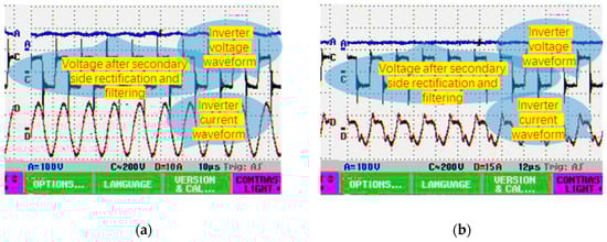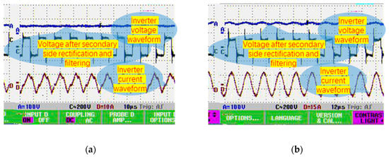 Figure 13 shows the experimental waveforms for a 20 cm lateral offset, where Figure 13a corresponds to a resonant frequency of 90 kHz and Figure 13b corresponds to a resonant frequency of 73.5 kHz. It can be seen from the figures that when the resonant frequency is 90 kHz, the phase difference between the output voltage and current of the inverter is large, and the current waveform has a high harmonic content and severe distortion. When the resonant frequency is 73.5 kHz, the phase difference between the output voltage and current of the inverter decreases, the distortion rate of the current waveform decreases, and the amplitude increases, resulting in an increase in the transmission power. Therefore, when the coupling coefficient decreases to a certain extent due to offset, the system has stronger power output capability at the sub-resonant frequency.