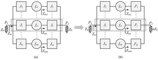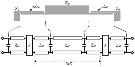 A multi-mode resonator, such as an SIR, has several resonating modes distributed within a UWB pass band. Figure 1 shows the circuit of a UWB bandpass filter containing an SIR, which is tightly coupled to two-sided ports with interdigital-coupled lines. The equivalent circuit is also given in Figure 1, and every interdigital coupling line can be equivalent to a sub-network containing the center J inverter and two-sided high-impedance lines. The center part of the whole network as an equivalent SIR has several resonating modes that can be equally spaced within a UWB passband by optimizing the lengths and characteristic impedances of the sections. Considering there is no coupling between the resonating modes of an SIR, every mode is independently coupled to the two-sided ports, and we can give the conceptual topology of a UWB bandpass filter, as shown in Figure 2a. Since the UWB bandpass filter is in a symmetric structure, we may find that the two-sided J inverters are the same.
