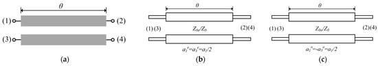When even-mode and odd-mode voltages are applied to ports 1 and, 3 respectively, the four-port network in Figure 3a can be simplified to the two-port networks shown in Figure 3b,c. The even- and odd-mode scattering matrices of two-port networks can be expressed as