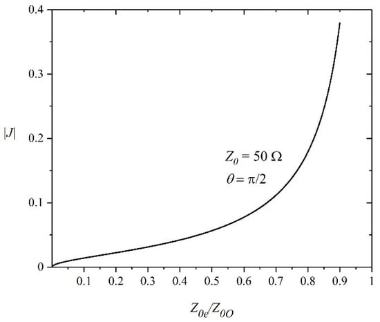 As shown in Figure 4, the dual ports’ parallel-coupled lines are equivalent to the J inverter. Combining Equations (9) and (10), we can get the relationship between the ratio of the even-mode characteristic impedance, Z0e, to the odd-mode characteristic impedance, Z0o, of the parallel-coupled line and J in Figure 5. It can be seen that |J| increases with the increase in the ratio, which means that greater J requires stronger coupling.