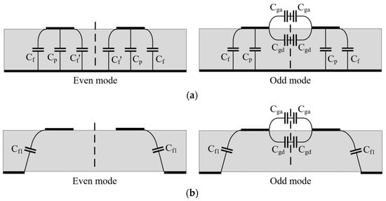 As shown in Figure 6a, for the microstrip-coupled lines, three types of capacitance are distributed between each microstrip line and the bottom metal layer of the substrate in the even-mode model, namely, the outer-edge distribution capacitance Cf, the middle distribution capacitance Cp, and the inner-edge distribution capacitance Cf’, while the outer-edge distribution capacitance Cf, the middle distribution capacitance Cp, the electrical wall capacitance in the air Cga, and the electrical wall capacitance in the substrate between two microstrip lines Cgd are distributed in the odd-mode model. The characteristic impedances of microstrip-coupled lines can be expressed as