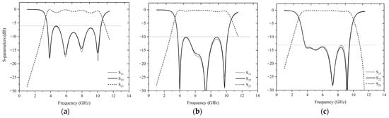 Simulated S-parameters of impedance transformers (from 50 Ω to 100 Ω) with different coupling structures: (a) Only two coupled lines, slot width S = 0.1 mm, strip width W0 = 0.1 mm; (b) DGS added under coupled lines, DGS width W2 = 0.5 mm, W4 = 3.4 mm; (c) more interdigital figures added as shown in Figure 6.