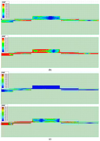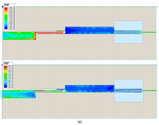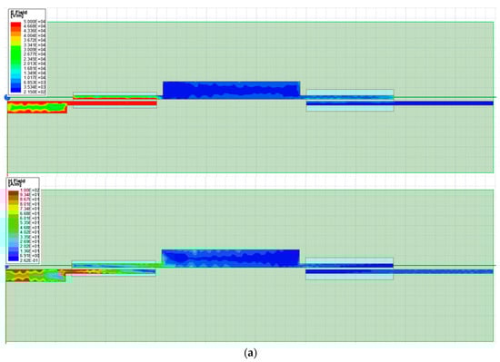 Equation (2) shows that the 50 Ω end of the impedance transformer needs stronger coupling than the 25 Ω end; hence, the DGS is adopted under the parallel-coupled line of the 50 Ω end. It can be seen from Figure 13b that when the frequency is less than 6 GHz, the insertion loss curve moves up with the increase in W2, while when the frequency is greater than 6 GHz, the S21 curve moves up first and then down with the increase in W2. This shows that only changing the coupling strength of the 50 Ω port cannot meet the coupling relationship in Equation (2); hence, the DGS is used near the 25 Ω port. Figure 14 shows the simulated S parameters as W4 increases when W2 = 1.1 mm. The dimensions of this impedance transformer after optimization are listed in Table 2. The E field and H field of the impedance transformer from 50 Ω to 25 Ω at different frequencies are given in Figure 15.