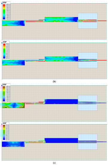 E field and H field of impedance transformers (from 50 Ω to 25 Ω): (a) 2 GHz; (b) 6.85 GHz; (c) 12 GHz.