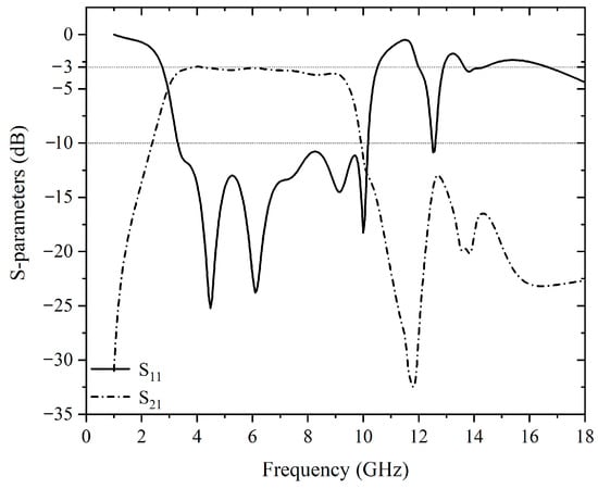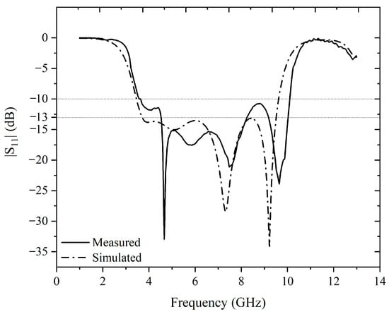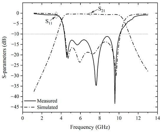 Figure 16 shows the simulated and measured S11. The S11 of the 50–25 Ω impedance transformer is better than −10 dB from 4 GHz to 10.6 GHz. Although not measured, the transmission coefficient S21 from port 1 to 2 can be computed roughly as