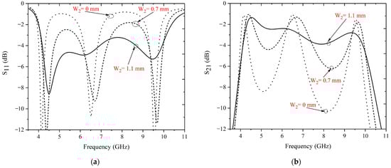 Simulated S-parameters (W4 = 0 mm, W2 = 0 mm, 0.7 mm, and 1.1 mm): (a) S11; (b) S21.