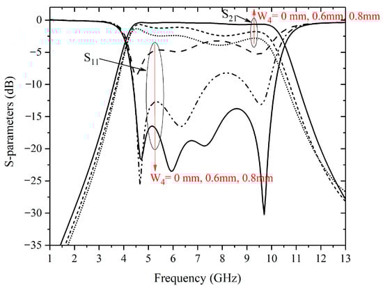 Simulated S-parameters (W2 = 1.1 mm, W4 = 0 mm, 0.6 mm, and 0.8 mm).