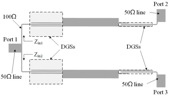 Unlike the symmetric structure for realizing UWB filters in [,,,,], unsymmetrical tight couplings containing DGSs at two sides of an SIR are used in this paper to realize impedance transformers. In addition, filtering power dividers based on UWB impedance transformers are proposed and designed. In [], a balanced-to-balanced in-phase filtering power divider based on microstrip/slotline transition structures and slotline T-junction was proposed, and the sharp filtering performance was realized by introducing the microstrip stub-loaded resonators. Although some filtering power dividers have been mentioned, they are rarely mentioned in the use of the UWB characteristics of SIR to UWB impedance matching and in the use of this impedance matching network to design a power divider. The UWB power divider with DC-blocking based on impedance matching network is necessary to research its flexible design and wide application scenarios.