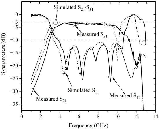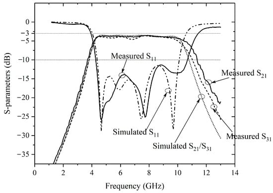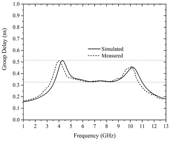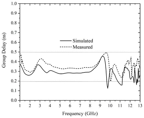 Figure 20 shows the comparison of simulated and measured results. Due to the measuring range of the test instrument, only the S-parameters before 13 GHz are shown here. Across the frequency band from 3.1 GHz to 9.5 GHz, the simulated insertion loss |S21|(|S31|) is approximately 3.4 dB and the return loss |S11| is better than 10 dB. Compared with the simulation results, the measured passband is shifted upward, covering a frequency range from 4 GHz to 10 GHz, mainly due to manufacturing tolerance. The measured return loss is better than 10 dB throughout the pass band. The insertion loss is approximately 3.6 dB in the range from 4 GHz to 8.4 GHz, 4.1 dB in the range from 8.4 GHz to 9.4 GHz, and 4.5 dB in the range from 9.4 GHz to 10 GHz. The rejection is larger than 30 dB from 12.5 GHz above. Within the UWB passband from 3.1 GHz to 9.5 GHz, the simulated and measured group delay between port 1 and port 2 are both less than 0.5 ns, and the in-band fluctuation of measured group delay is less than 0.3 ns as shown in Figure 21. Due to the symmetry of the structure, the group delay curve between ports 1 and 3 overlap with those of ports 1 and 2 and is not shown here.
