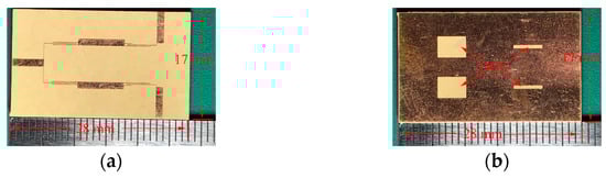 Photographs of the fabricated filtering UWB impedance transformer (from 50 Ω to 100 Ω): (a) Top view; (b) Bottom view.