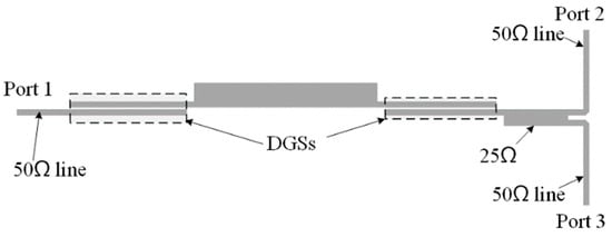 In addition, the UWB power divider composed of a single transformer (from 50 Ω to 25 Ω) has no singular point in the stopband because the strong coupling structures at both ends of the transformer are only composed of DGSs. The loading effect of strong coupling structures has little impact on the resonant frequencies’ distribution of SIR.