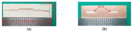 where vpe1 and vpo1 are phase velocities of even/odd modes. Compared to microstrip-coupled lines, DGS-loaded coupled lines lack the middle distribution capacitance Cp and the inner-edge distribution capacitance Cf’, and the outer-edge distribution capacitance varies with the width of the DGS, as shown in Figure 6b, whose characteristic impedance can be expressed as
