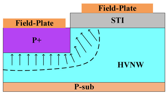 Two common field plate structures were used. The first was a field plate connected to an electrode (i.e., the contact field plate; Figure 2). The second was a floating field plate placed independently above the STI (Figure 3).