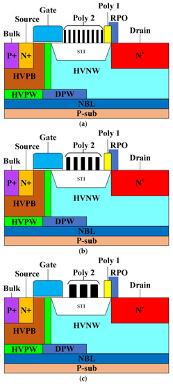 Cross-sectional views of the high-voltage nLDMOS (a) S1_9R, (b) S1_5R, and (c) S1_3R devices.